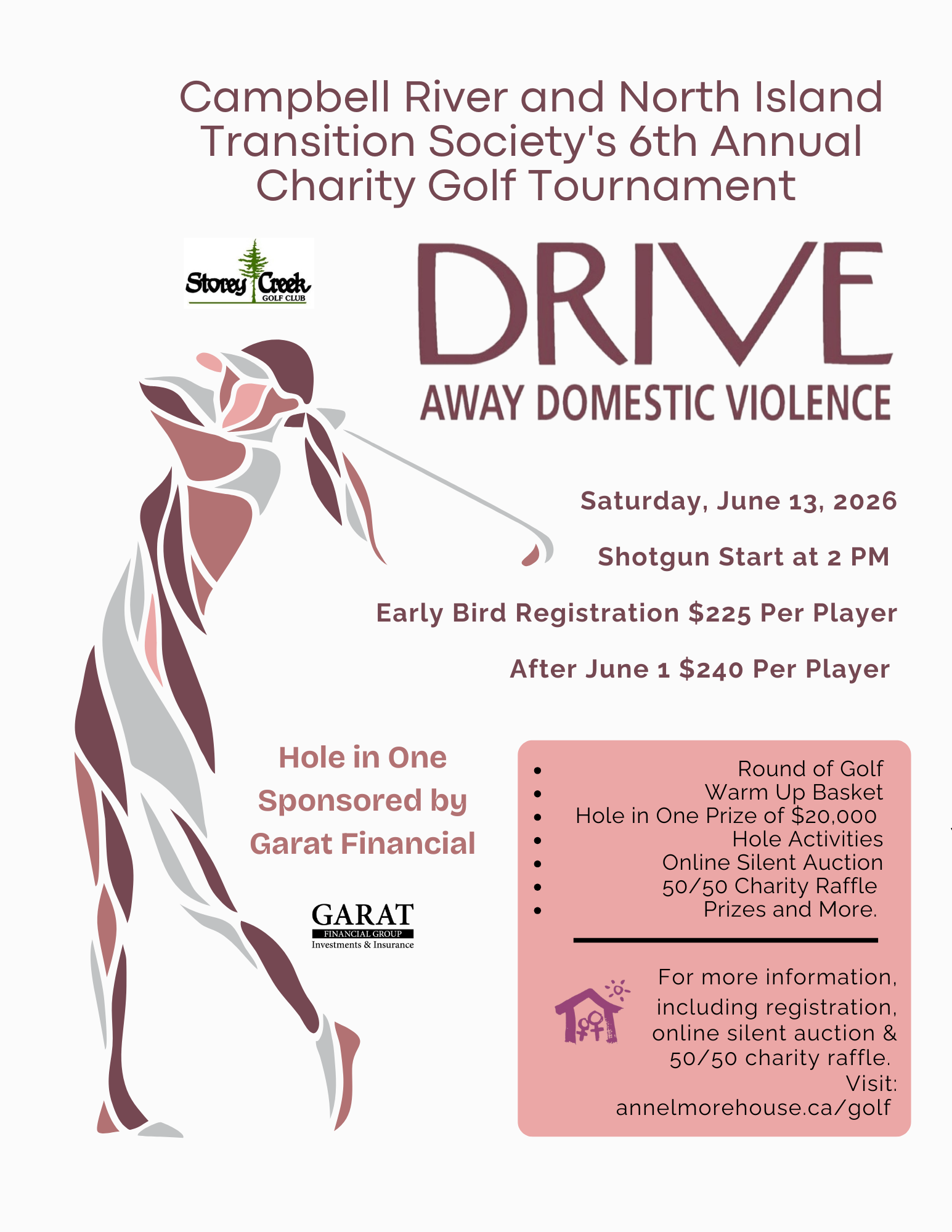 The Drive Away Domestic Violence is a shotgun start golf tournament to raise money for programs and services that provide safe shelter and access to resources for women and children.